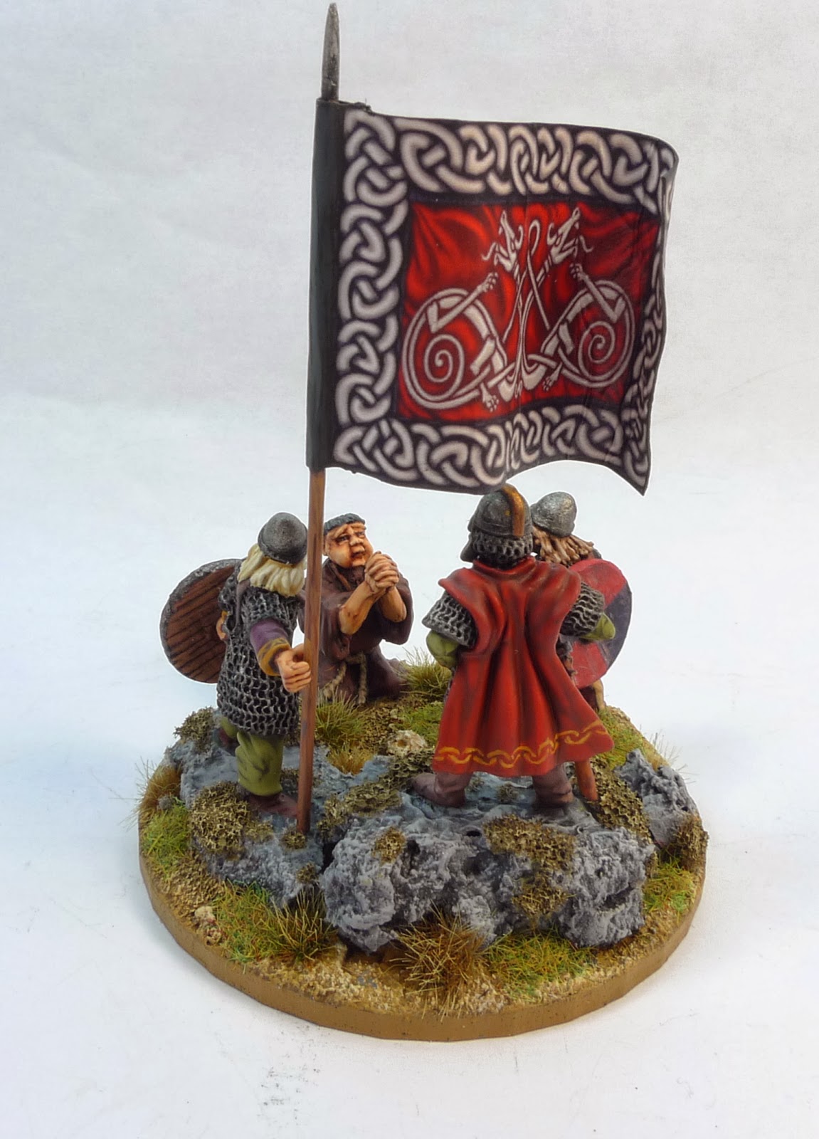 The nice thing about the Dark Ages is that we are spoiled for choice of good models from many manufacturers. Downside is that you spent too long deciding which models to pick for your units and how to compose a vignette..After a start with some attacking poses I decided I liked this one better so started to experiment to create rocks out of cork. Really easy actually, the only hard thing was to get the feet instead of the base om the rock. You could remove the base and then pin it but I just carved a hole the size of the base and put the mini in the cork. Fill it up with plastic putty and done..The moss was done using foam that comes with a blister pack.